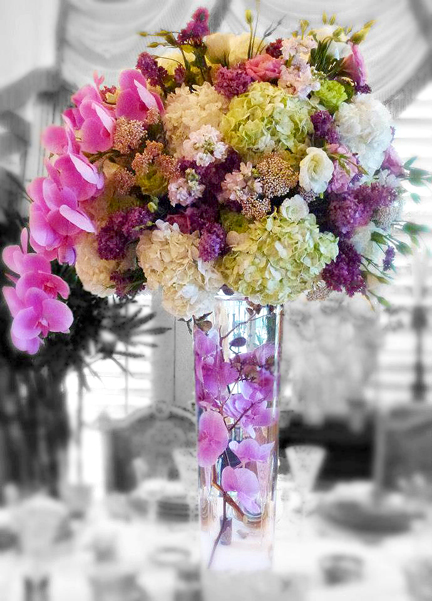 D-6 Published March 30, 2013 at 432 × 601 Tall Centerpiece with Orchids, Hydrangea, Roses, Lisianthus