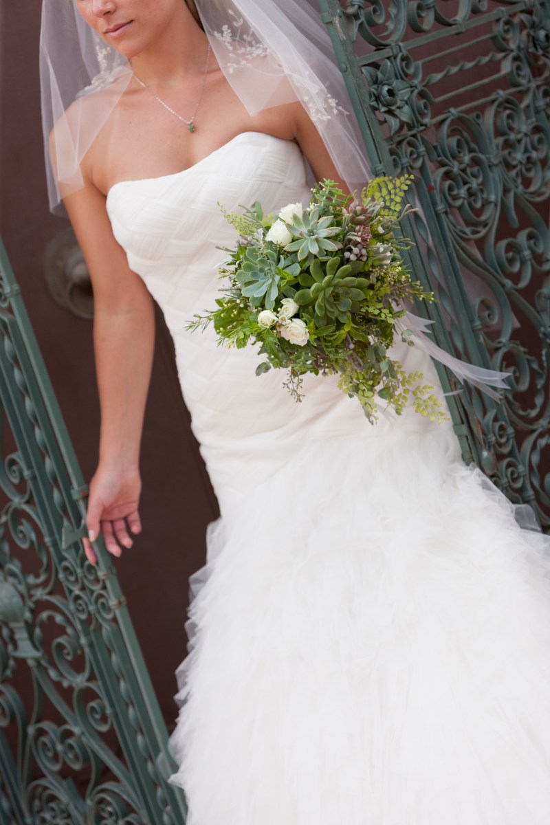 Newcombe 0178 Published September 8, 2014 at 3744 × 5616 Gorgeous Succulent bouquet with fern and spray rose accents; Mission Inn Hotel and Spa; Tony Reyes Photography