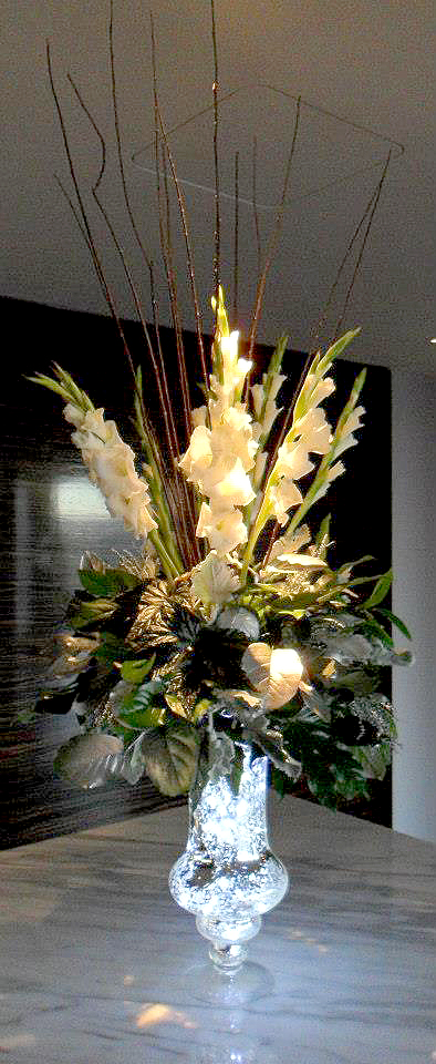 A-14 Published March 29, 2013 at 394 × 960 in Bouquets ← Previous Next → Stunning Centerpiece with White Gladiolas, Greenery sprayed with Silver in a Lighted Mercury Vase Like Loading...
