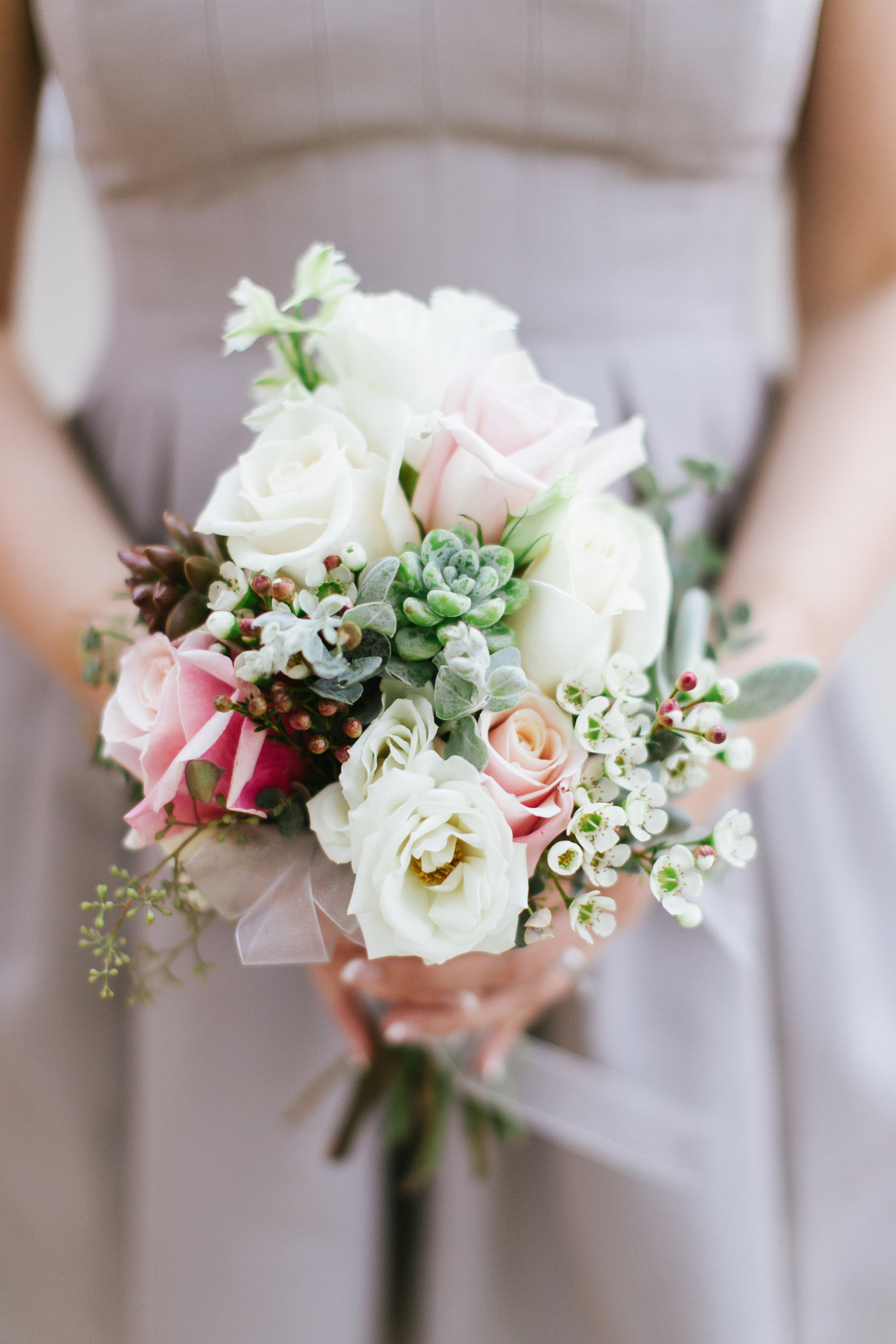 Bridesmaids bouquet with lisianthus, roses, wax flower, and succulents. Photography by http://www.mariesamsanchez.com photography.
